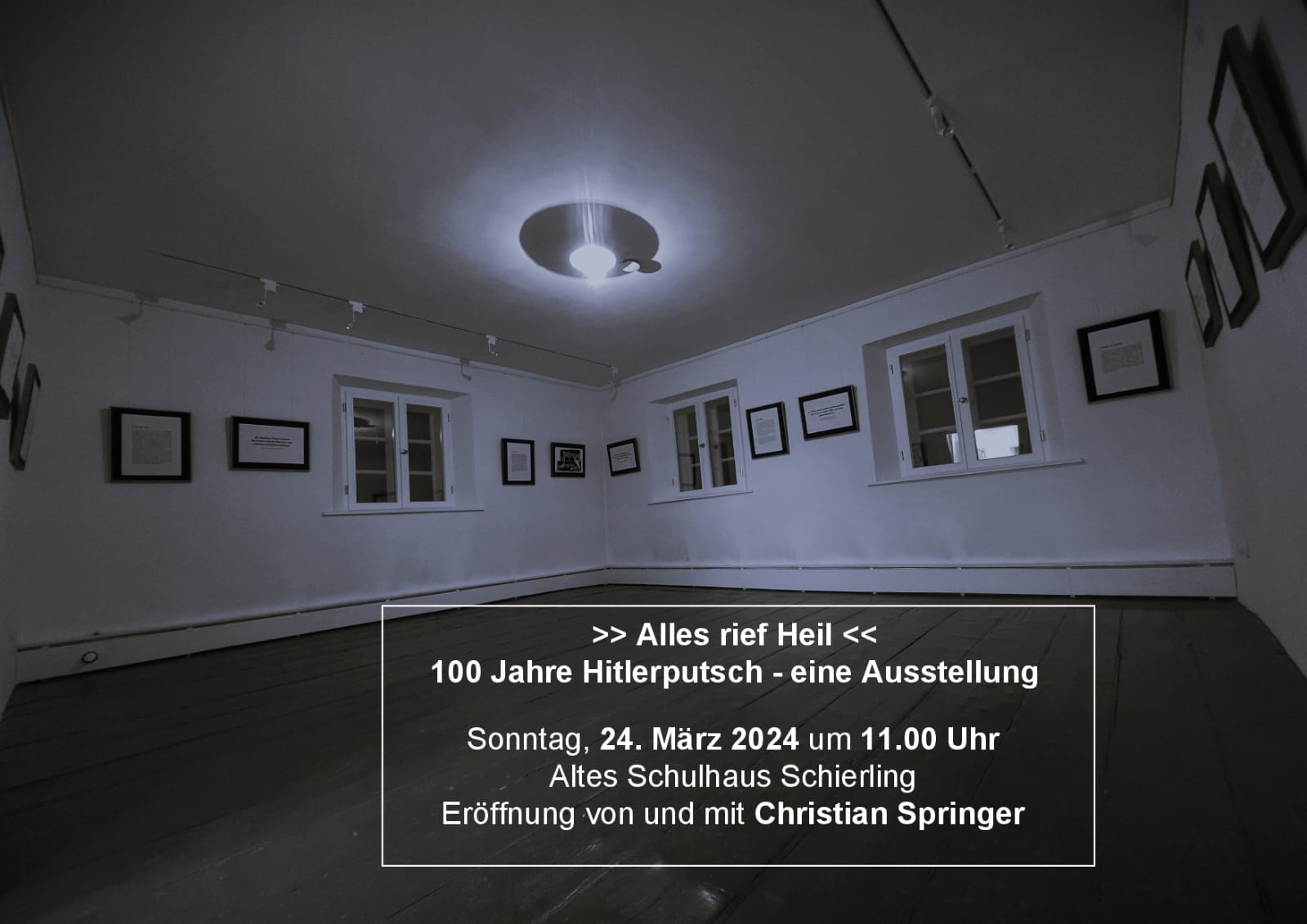 Am kommenden Sonntag, dem Palmsonntag, wird um 11 Uhr im ältesten Schulhaus durch den Münchner Kabarettisten Christian Springer die Ausstellung „Alles rief Heil“ eröffnet. Mit ihr wird an den „Hitler-Putsch“ am 8. November 1923 im Bürgerbräukeller München erinnert. Die Initiatoren Kerstin Schweiger und Bürgermeister Christian Kiendl sehen in der Installation die wichtige Chance, aus der leidvollen Erfahrung der Geschichte zu lernen und die richtigen Schlüsse zu ziehen.