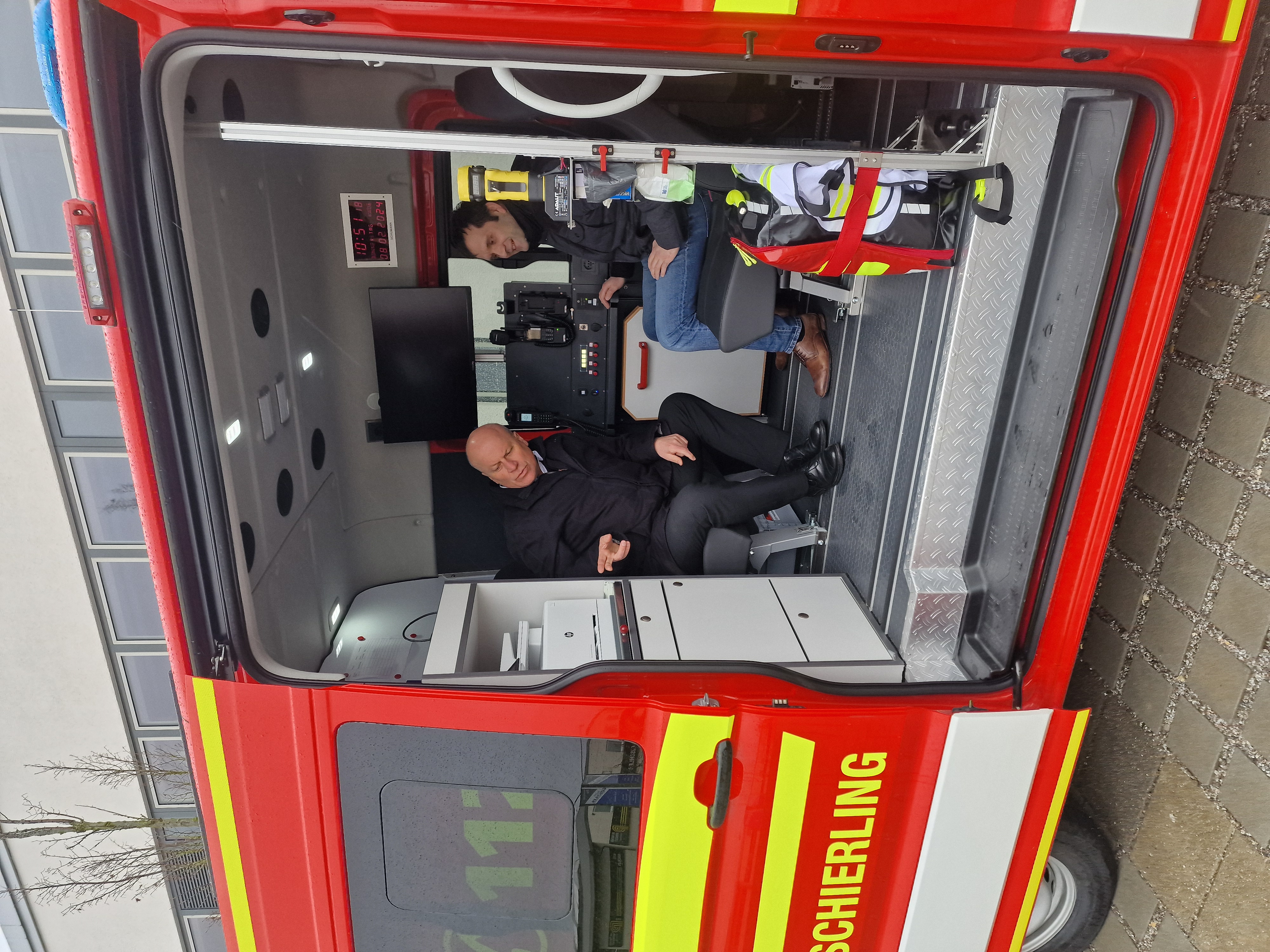 Das Feuerwehrfahrzeug, das Bürgermeister Christian Kiendl (li.) und Reiner Daller vom Bauamt inspizieren, dient auch als mobile Einsatzzentrale. Es ist mit einer Lautsprecheranlage ausgestattet, mit der im Notfall die Bevölkerung informiert werden kann.