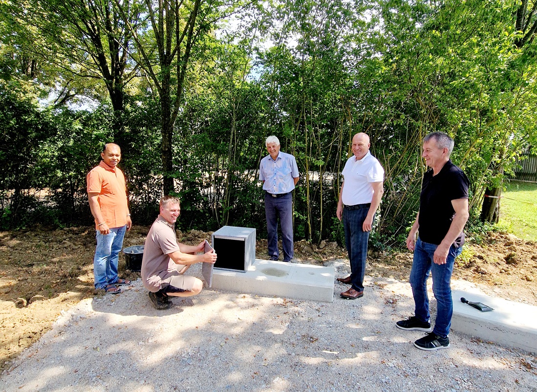 Bildunterschrift: v.l. Pfarrer Justine Chakkiath, Mitarbeiter der Firma Aumer Urnendom, Marktgemeinderatsmitglied Anton Blabl, Bürgermeister Christian Kiendl und Bauhofleiter Hermann Diermeier.