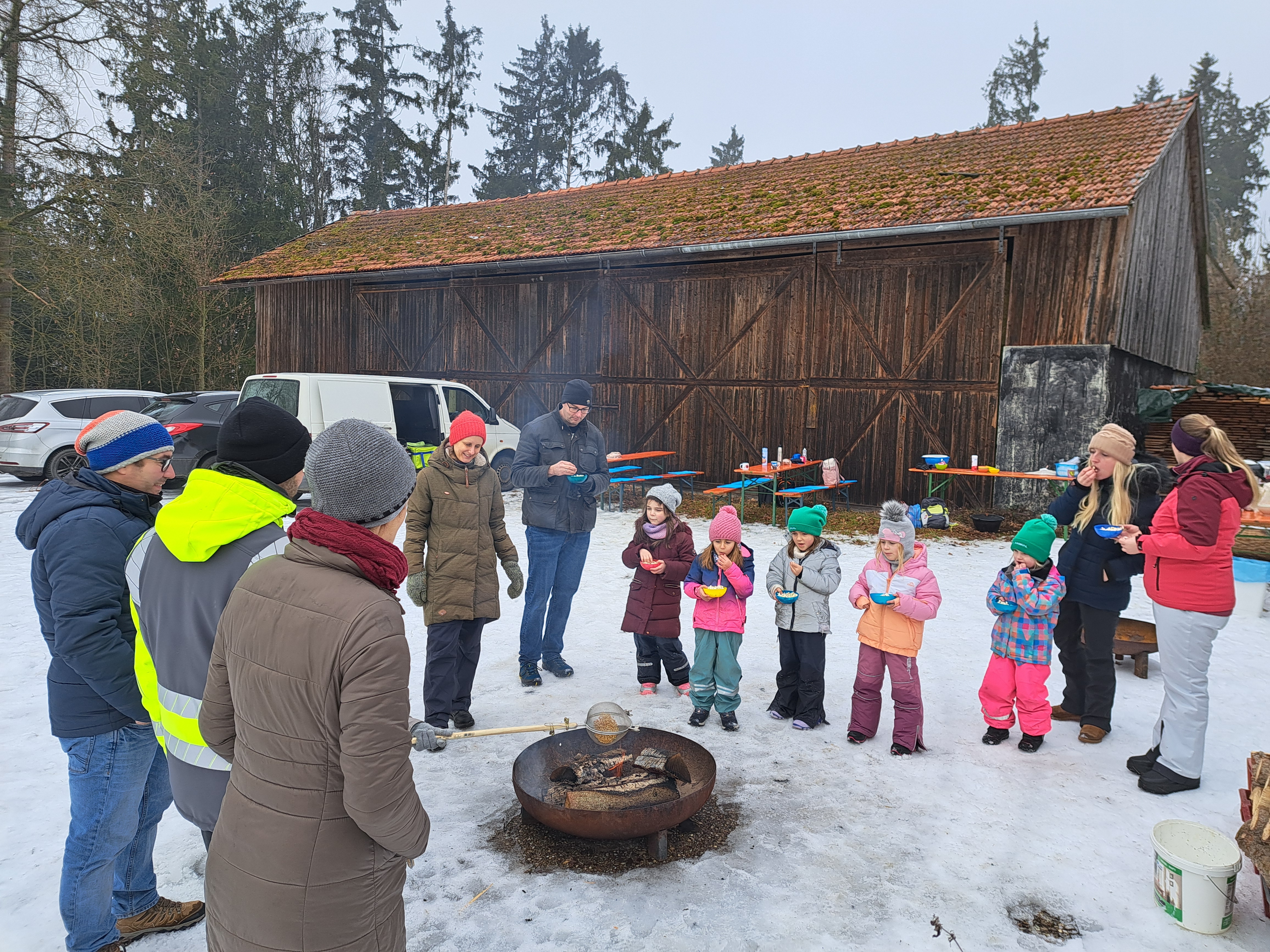 Den Abschluss bildete der Aufenthalt am Feuerplatz. Die Teilnehmenden entfachten selbst ein Feuer ohne Streichhölzer oder Feuerzeug und bereiteten gemeinsam eine Suppe über dem offenen Feuer zu. Auch Popcorn über dem Feuer durfte nicht fehlen. Heißer Punsch und Kaffee sorgten für Wärme. Parallel dazu gab es Aufwärmspiele sowie eine Bastelaktion, bei der jedes Kind eine kleine Erinnerung in Form eines Magneten oder Anhängers aus einer Holzscheibe mit Tierabdruck gestaltete.