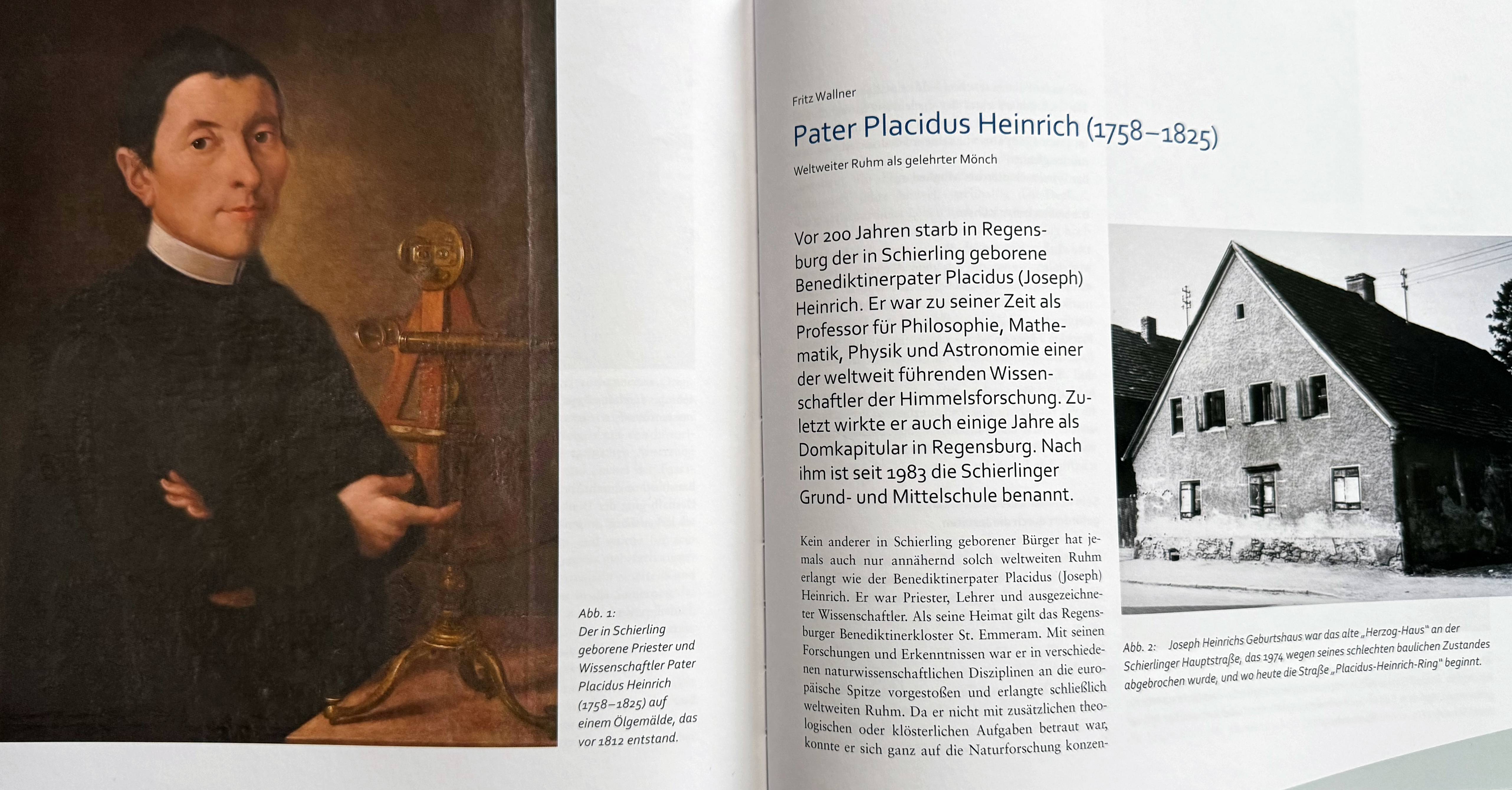 Mit Pater Placidus Heinrich (1758-1825) wird diesmal die berühmteste Persönlichkeit Schierlings ausführlich vorgestellt. Unter dem Titel „Weltweiter Ruhm als gelehrter Mönch“ hat der Autor Fritz Wallner das Leben und Leistungen des Benediktiners zusammengestellt, der in Schierling geboren wurde und vor 200 Jahren in Regensburg starb. Er war zu seiner Zeit als Professor für Philosophie, Mathematik, Physik und Astronomie einer der weltweit führenden Wissenschaftler der Himmelsforschung. Einige Jahre wirkte Placidus Heinrich auch als Domkapitular in Regensburg. Nach ihm ist seit 1983 die Schierlinger Grund- und Mittelschule benannt.