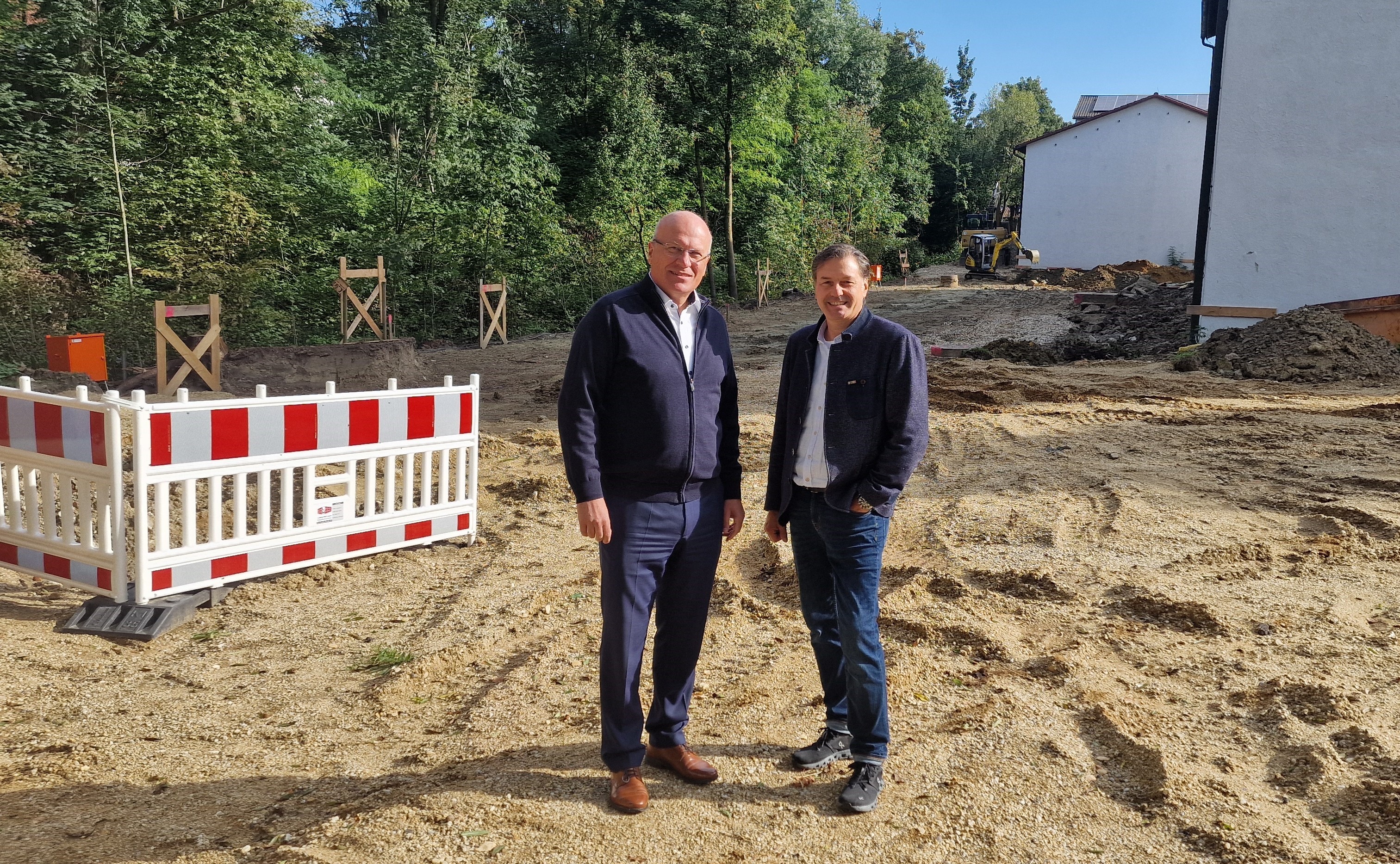 Bild: Bürgermeister Christian Kiendl und Rektor Josef Hoffmann kurz vor Schulstart auf der Baustelle – zwischen Bauzaun und Baggern.