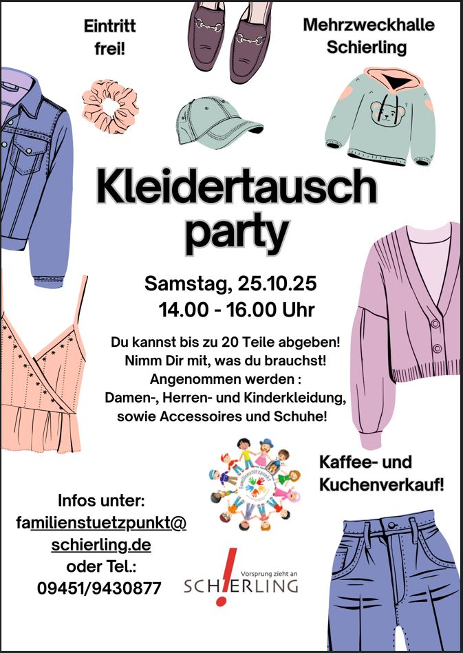 Keine Anmeldung erforderlich! Infos beim Familienstützpunkt unter: familienstuetzpunkt@schierling.de oder tel: 09451/9430877