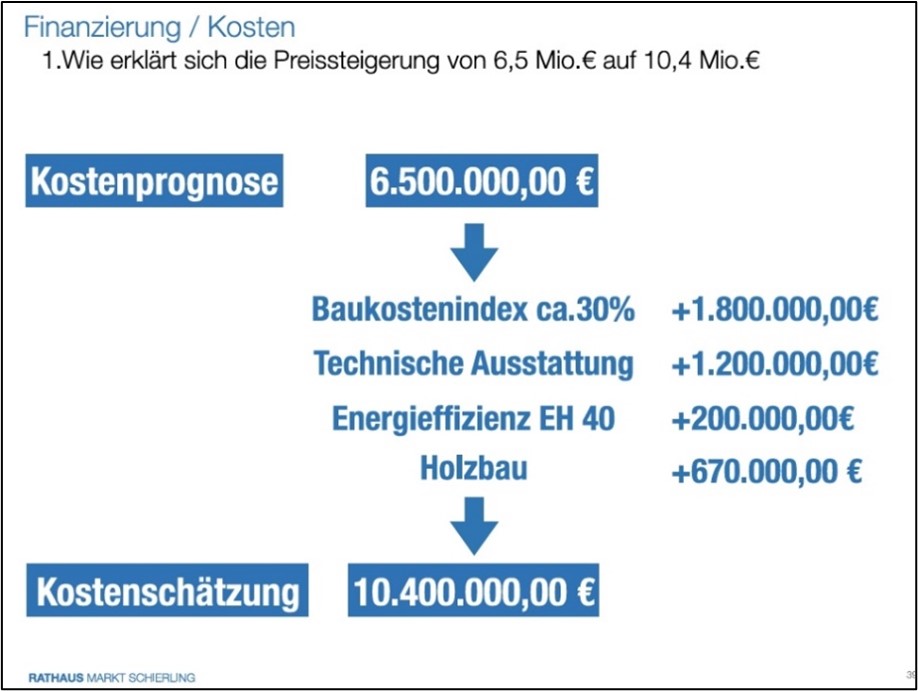 Nicht zuletzt aufgrund des Krieges gegen die Ukraine und der damit verbundenen Verwerfungen der gesamten Wirtschaft lag die exaktere (aber immer noch nicht ins Detail gehende) Kostenschätzung bei der Vorstellung im Marktgemeinderat am 25.05.2023 bei rund 10,4 Millionen Euro. Dabei waren allein rund 670.000 Euro zusätzliche Kosten für den vom Marktgemeinderat gewünschten Holzbau enthalten.